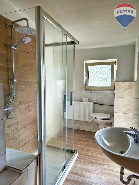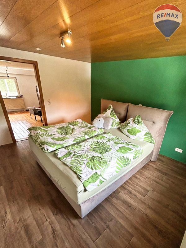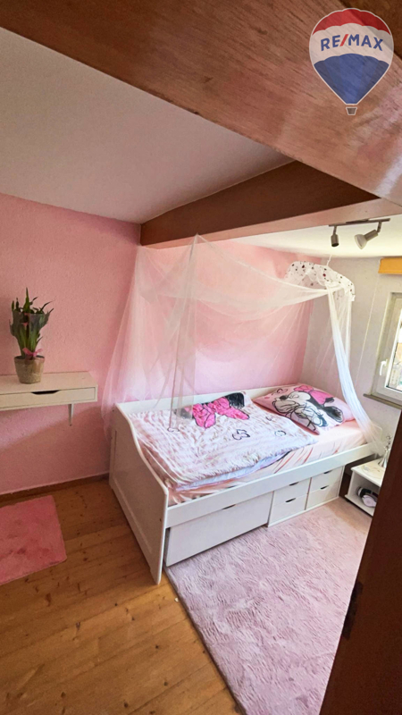 Über eine Holztreppe gelangen Sie in das Obergeschoss, wo sich insgesamt drei weitere Zimmer, eines davon ist ein Durchgangszimmer, sowie das Bad und die Dachterrasse befinden. Zwei der drei Zimmer sind ca. 14 m² groß, während das dritte Zimmer lediglich ca. 8 m² groß ist. In das moderne Tageslicht-Badezimmer, das vor einem Jahr renoviert wurde, geht man 4 Stufen nach unten. Dort befinden sich das Waschbecken, das WC sowie eine große, ebenerdige Dusche. Vom Bad aus gelangt man auf die ca. 8 m² große und überdachte Dachterrasse.