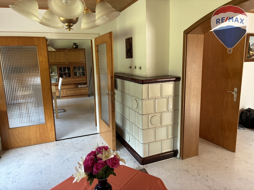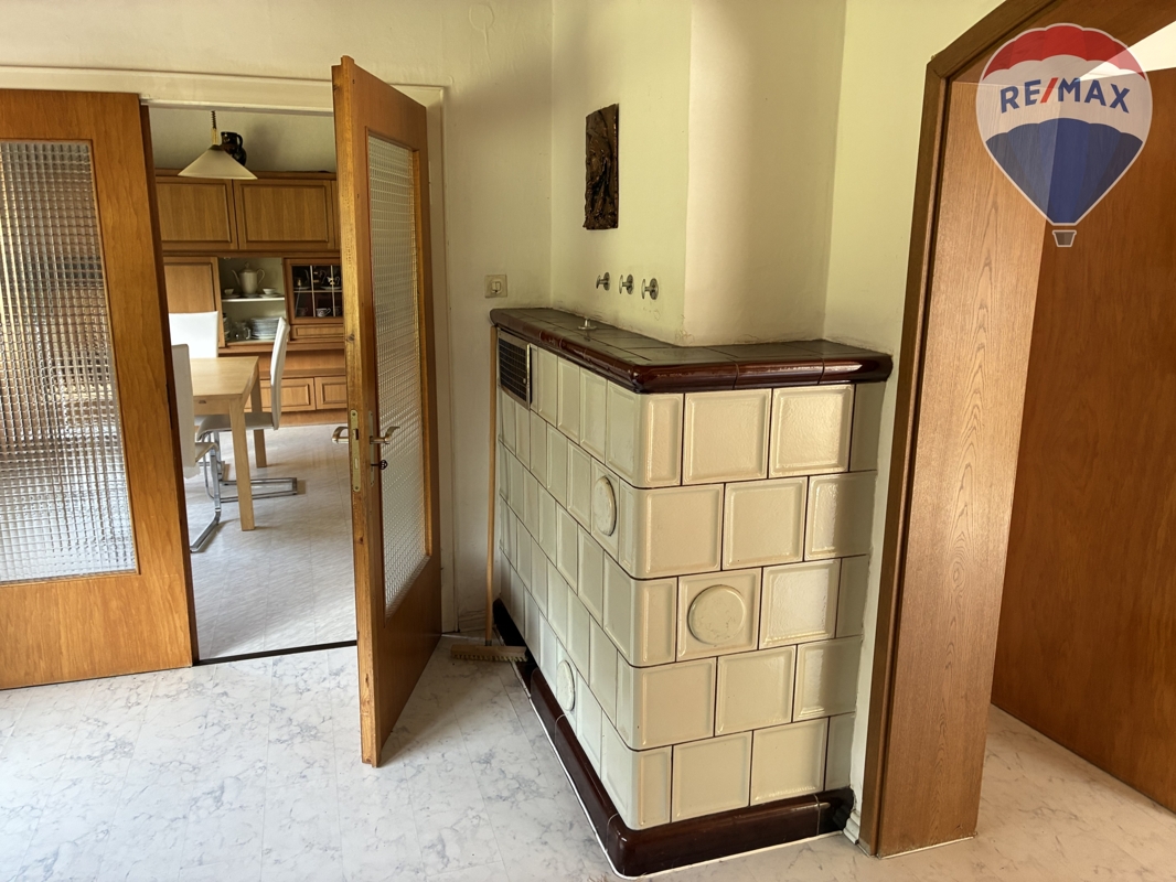 Der historische Charme des Hauses wird durch die mit Pfannen gedeckte Dachkonstruktion und die zweifach verglasten Holzfenster aus der Zeit vor 1983 ergänzt. Die Heizung erfolgt traditionell über einen Öl-Kachelofen, der mittels Luftschächten die Wärme in die einzelnen Zimmer verteilt. Die Elektroinstallation ist älteren Datums und die Wasserleitungen bedürfen ebenfalls einer Aktualisierung.